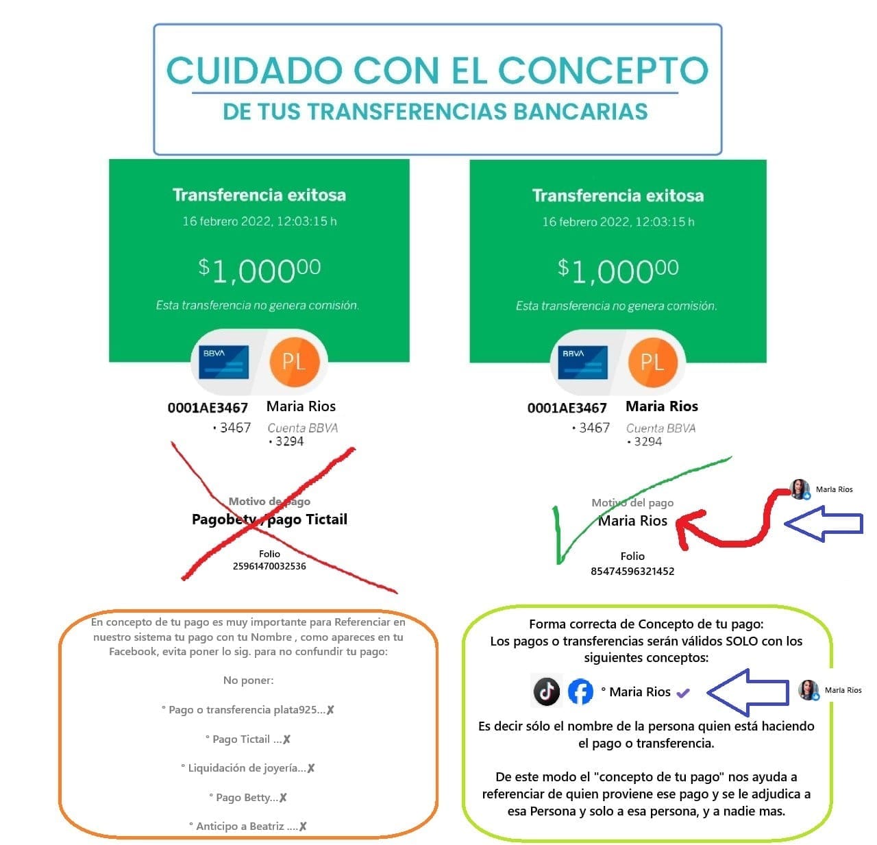 Importante:Al realizar el pago en ventanilla, indica que es un "abono a cuenta" o "depósito a cuenta", no un "envío de dinero". Esto es debido a las leyes mexicanas contra el lavado de dinero. Solo se aceptan depositos y transferencias. No se aceptan envios de dinero posfechados.